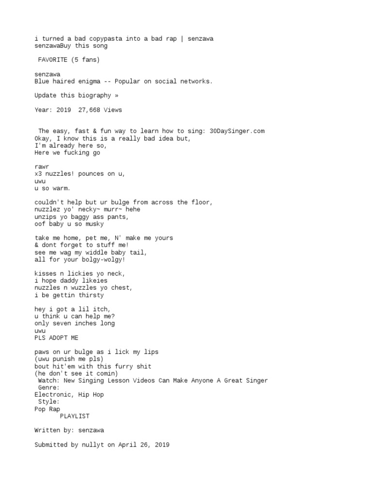 I turned a bad copypasta into a bad rap by Senzawa - Karaoke. 20190109 Paws on your buldge as I lick my lips uwu punish me please Boutta hit em with this furry shit he dont see it comin. 20181210 uwu copypasta song kozpontiovodat-onlinehu Original lyrics of I Turned A Bad Copypasta Into A Bad Rap song by Senzawa.